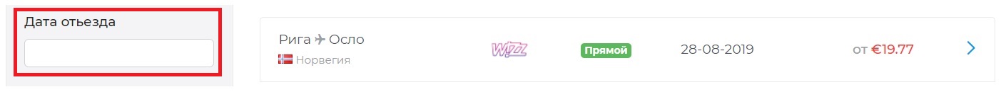 - “Цена” – Выбрав все нужные критерии, в календаре низких цен появятся рейсы авиакомпаний в назначенный пункт полёта. Цены сортируются от самой дешевой. Выберите наилучшее для Вас предложение и нажмите на него, например “Рига Осло (Wizzair) – €19.77″
