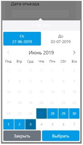 По умолчанию указывается полёт “В одну сторону”. Если вы хотите резервировать полёт в обе стороны, тогда нужно нажать на серый кружок перед “Туда-обратно”. - “Дата отъезда” – В этом разделе Вы можете выбрать дату вылета. Нажмите на пустое поле, после чего появится окно с календарем.