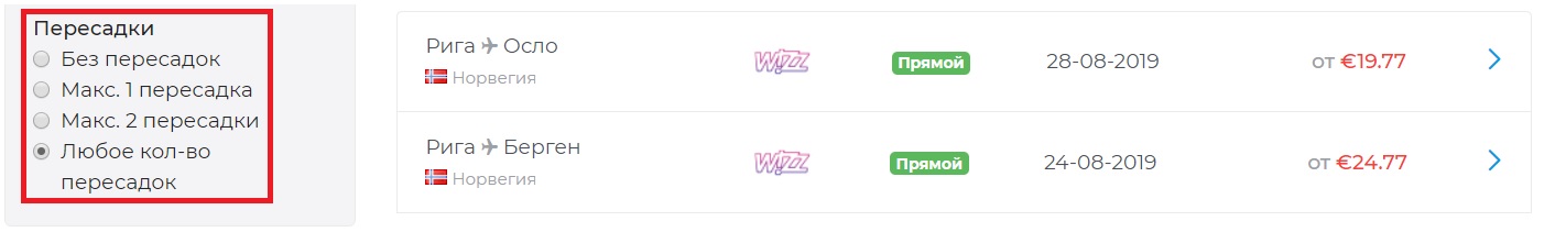 - “Пересадки” – Выберите полёт с пересадкой или без пересадки. Что бы отметить нужный фильтр, нажмите на серый кружок. По умолчанию отмечен критерий “Любое количество пересадок”, что подразумевает показ самых дешевых авиабилетов.